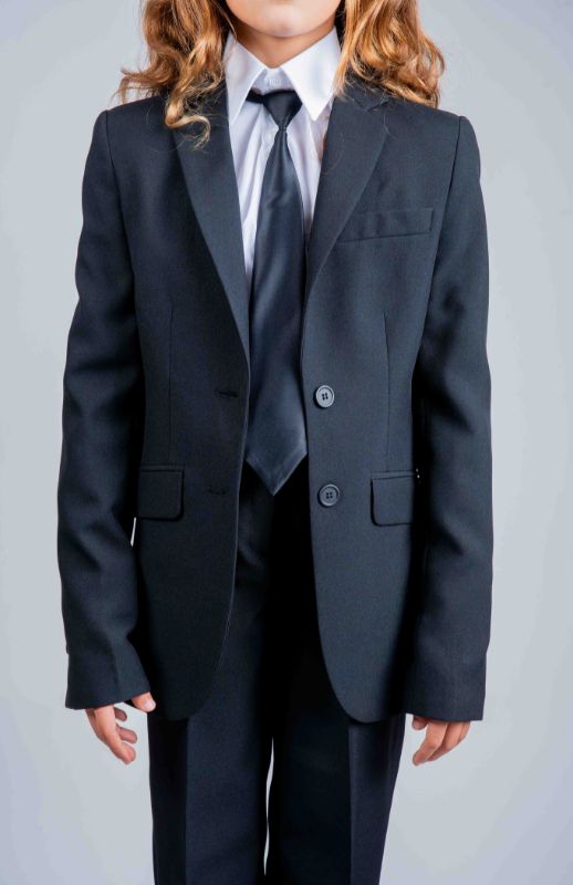 Americana de músico para niño/niña en color negro, con forro interior, dos botones frontales y dos aberturas traseras. Confeccionada en 100% poliéster texturado, es lavable en lavadora, cómoda y resistente. Ideal para conciertos, pasacalles y actuaciones escolares.